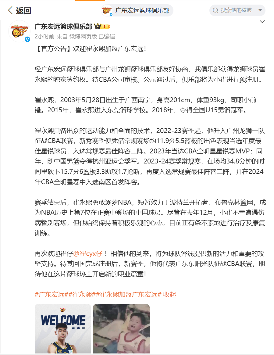 崔永熙更新了个人微博,他晒出一组照片,其中就有一张他小时候穿宏远球衣的照片,并写道:“为宏远效力是我小时候的梦想,原来一切都有迹可循。我是从小看着广东宏远打球长大的孩子,难以想象会有这种奇妙的缘分将我CBA和NBA不同时期两个梦想联动在了一起。感谢广东宏远篮球俱乐部的信任,在我伤病康复的最后阶段坚定选择了我,给予了我很大的力量和信心!”