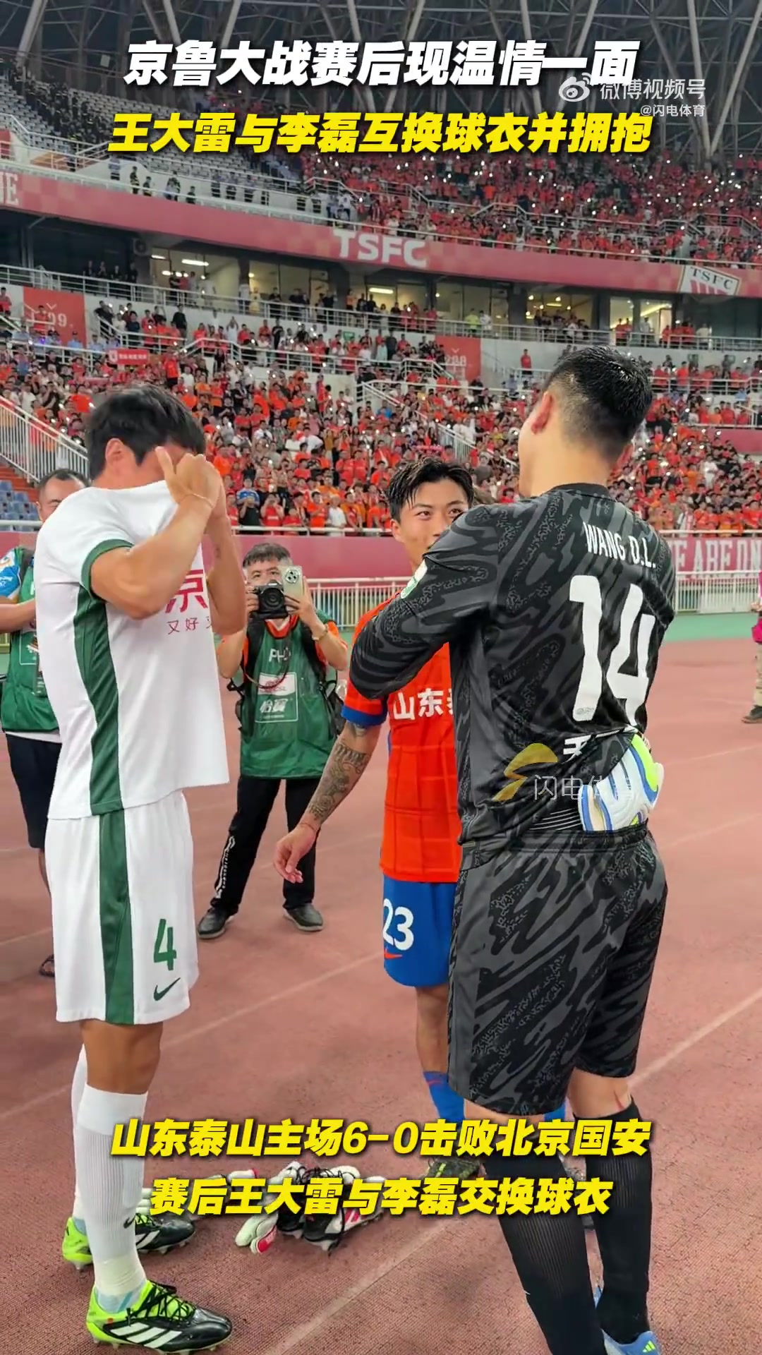 西甲2025-京鲁大战赛后温情一幕,王大雷和李磊交换球衣并拥抱